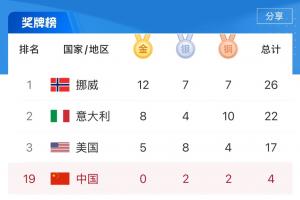 體育資訊02月16日訊 米蘭冬奧會(huì)第9個(gè)比賽日戰(zhàn)罷,中國(guó)隊(duì)仍2銀2銅,排在第19。挪威12金7銀7銅高居第一,意大利8金4銀10銅第二,美國(guó)5金8銀4銅第三。