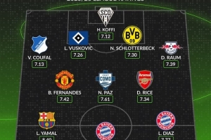后衛(wèi):曹法爾(霍芬海姆,7.13分)、武什科維奇(漢堡,7.26分)、施洛特貝克(多特蒙德,7.30分)、勞姆(萊比錫,7.39分)