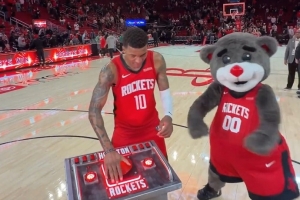賽后,小賈巴里·史密斯出席火箭主場(chǎng)的新儀式,拍下按鈕讓火箭升空。