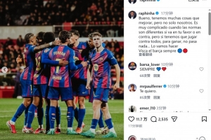 體育資訊2月17日訊 西甲第24輪比賽,巴薩客場1-2不敵赫羅納,巴薩邊鋒拉菲尼亞更新社媒動態(tài),表達(dá)對判罰的不滿。