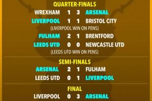 1/4決賽,阿森納3-1淘汰雷克瑟姆,利物浦則通過點(diǎn)球大戰(zhàn)擊敗布里斯托城,富勒姆2-1布倫特福德,利茲聯(lián)則依靠點(diǎn)球大戰(zhàn)淘汰紐卡晉級(jí)四強(qiáng)。