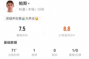 體育資訊2月19日訊 科莫在本輪意甲1-1暫時(shí)戰(zhàn)平米蘭,帕斯本場(chǎng)數(shù)據(jù)如下: