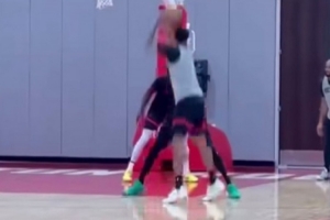 體育資訊2月19日訊 美媒露天看臺曬出了火箭全明星后首次訓(xùn)練畫面,寫道:“杜蘭特成功防下小賈巴里。”