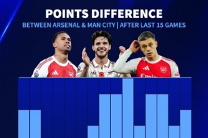 近15場英超比賽阿森納領(lǐng)先曼城積分: