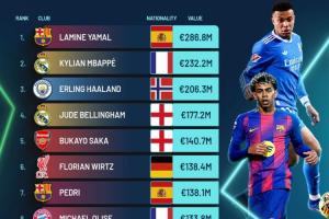 體育資訊02月19日訊 Football Benchmark今日更新了球員身價(jià),在其最新的身價(jià)排行中,亞馬爾以2.868億歐位居榜首,姆巴佩和哈蘭德也突破2億歐。