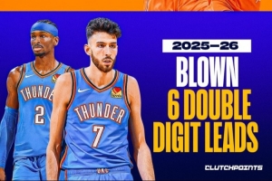 體育資訊2月21日訊 據(jù)美媒ClutchPoints統(tǒng)計,上賽季,雷霆在奪冠的歷程中(常規(guī)賽+季后賽)一共僅5次在手握兩位數(shù)領先的情況下被逆轉。