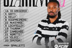 尤文首發(fā):16-迪格雷戈里奧、4-加蒂、6-凱利、27-坎比亞索、5-洛卡特利、8-庫普梅納斯、19-凱夫倫·圖拉姆、22-麥肯尼、21-米雷蒂、10-伊爾迪茲、20-奧蓬達(dá)