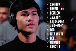 39-薩福諾夫、2-阿什拉夫、4-貝拉爾多、6-扎巴爾尼、21-盧卡斯、33-扎伊爾·埃梅里、27-德羅、19-李剛?cè)省?4-杜埃、9-貢薩洛·拉莫斯、29-巴爾科拉
