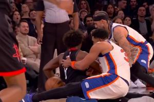 GIF-唐斯撲球 坐到了泰特的右膝 泰特受傷離場了……
