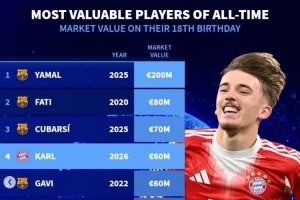 德轉(zhuǎn)列歷史18歲生日時(shí)球員身價(jià)榜:歐元