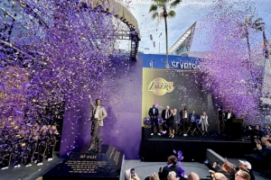 體育資訊2月23日訊 今日湖人為球隊傳奇主教練帕特·萊利舉行雕像揭幕儀式。