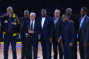 現(xiàn)場,湖人眾名宿出席儀式;萊利打趣道:“在所有來的這些人中,只有一個人向我展示了真正的尊重,那就是詹姆斯·沃西(上圖左1),他穿了西服打了領(lǐng)帶。其他的人都太隨意了,每人罰你們2000美元?!?/p>