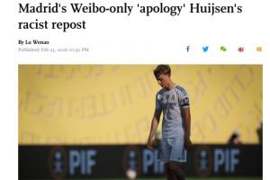 體育資訊02月23日訊 《環(huán)球時(shí)報(bào)》英文版網(wǎng)站發(fā)文報(bào)道了赫伊森轉(zhuǎn)發(fā)辱華內(nèi)容的事件,文章的標(biāo)題為《中國(guó)球迷對(duì)皇馬僅在微博發(fā)布的"道歉"表示不滿(mǎn),此前赫伊森轉(zhuǎn)發(fā)種族歧視內(nèi)容》。