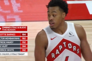 轉(zhuǎn)播方統(tǒng)計(jì),巴恩斯本賽季搶斷+蓋帽之和164次,超越文班排名聯(lián)盟第一。