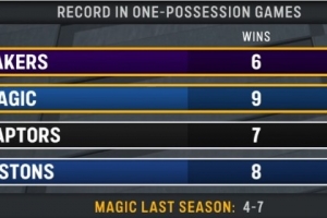 湖人主場迎戰(zhàn)魔術,轉(zhuǎn)播方給出一項統(tǒng)計,本賽季一回合定勝負(分差3分以內(nèi))的比賽,湖人6勝0負排名第一,魔術9勝3負排名第二。