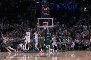 騎士最后一攻不暫停,施羅德帶球上籃丟了,但是阿倫拿到前場板勾手打進,可惜超時了。