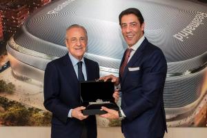 體育資訊02月26日訊 皇馬vs本菲卡次回合賽前,兩家俱樂(lè)部的主席弗洛倫蒂諾和魯伊·科斯塔互贈(zèng)禮物。