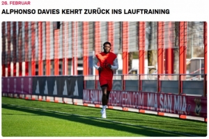 體育資訊2月26日訊 拜仁官網(wǎng)發(fā)文,確認(rèn)邊后衛(wèi)阿方索·戴維斯恢復(fù)跑步訓(xùn)練。