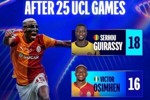 數(shù)據(jù)統(tǒng)計(jì)顯示,奧斯梅恩(尼日利亞)在25場(chǎng)歐冠后打進(jìn)16球,也超越了藍(lán)軍傳奇德羅巴(科特迪瓦)的同期數(shù)據(jù)(15球),在非洲球員中僅次于18球的吉拉西(幾內(nèi)亞)。
