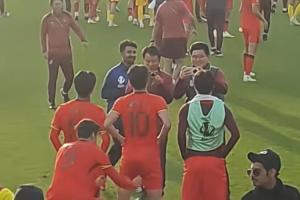 中國U23國足0-0泰國U23,實(shí)現(xiàn)U23亞洲杯歷史首次出線。賽后王鈺棟拍合影,拜合拉木趁機(jī)扒褲子,王鈺棟回頭看錯方向。
