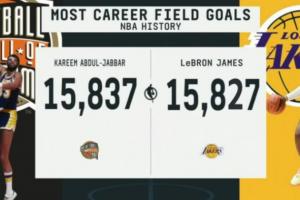 湖人球星勒布朗·詹姆斯目前職業(yè)生涯進(jìn)球數(shù)15827記,距離歷史第一的賈巴爾僅差10記,有望在今日完成超越登頂歷史第一。