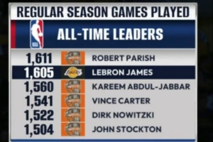 詹姆斯已經(jīng)出戰(zhàn)1605場常規(guī)賽歷史第二,距離第一的帕里什只差6場,除了還在征戰(zhàn)的詹姆斯,前六的另外五位球員都已經(jīng)入選名人堂。