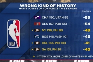 轉(zhuǎn)播方賽前曬出一組數(shù)據(jù),本賽季共有6次主隊輸球至少凈負(fù)40分的情況: