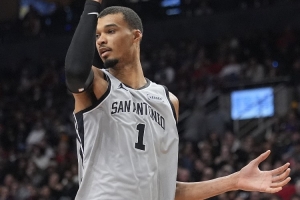 賽后,斯圖爾特接受了記者采訪。談到文班亞馬,他說道:“他是個高個子,占了很大的空間。我們必須更好地調(diào)動他,直接沖擊他的胸部(playing straight through his chest)。這對我們有幫助,也是他的弱點所在,當(dāng)防守者沖向他的胸部時(when he’s got defenders going at his chest),他會掙扎?!?/p>