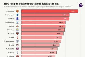 英超各隊門將平均拿球/撲救后球出手時間: