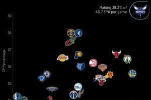 橫軸-三分總出手?jǐn)?shù);縱軸-三分命中率;黃蜂場均出手43.7次&命中率為39.3%