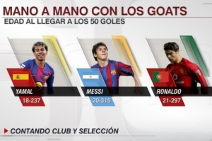 據(jù)統(tǒng)計(jì),18歲237天的亞馬爾生涯各項(xiàng)賽事已經(jīng)打進(jìn)50粒進(jìn)球(俱樂(lè)部+國(guó)家隊(duì)),梅西打進(jìn)生涯50球時(shí)為20歲315天,C羅則是21歲297天。