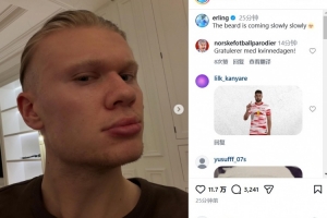 在社交媒體上,哈蘭德延續(xù)了自己一貫不茍言笑的風(fēng)格,他曬出了自拍照并寫道:胡須一點點長出來了。