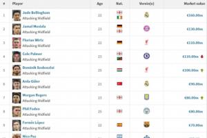 進(jìn)攻型中場(chǎng)德轉(zhuǎn)身價(jià)排名: