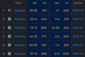 庫(kù)里缺席時(shí)勇士戰(zhàn)績(jī)9-16,勝率36.0%