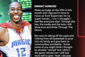 體育資訊03月13日訊 今日,2025年奈史密斯籃球名人堂成員、2004年NBA狀元秀、2019-20賽季NBA總冠軍&3屆DPOY(2009、2010、2011年)&5屆NBA一陣(2008-2012年)&4屆最佳防守陣容一陣(2009-2012年)&8屆全明星(2007-2014年)、5次籃板王(2008、2009、2010、2012、2013年)、2次蓋帽王(2009、2010年)、2008北京奧運(yùn)會(huì)金牌得主德懷特·霍華德在自己的個(gè)人社媒發(fā)布長文宣布退役。