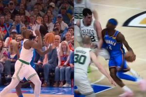 比賽中,SGA在一次合球掛手臂造成犯規(guī)后,杰倫·布朗當(dāng)即對裁判表示:“這不是籃球?!?/p>