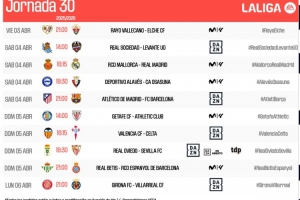 體育資訊3月14日訊 西甲官方公布了第30輪比賽時間,4月4日22點15分馬略卡vs皇馬,4月5日3點馬競vs巴薩。