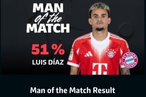 體育資訊3月15日訊 德甲第26輪,拜仁客場(chǎng)1-1戰(zhàn)平勒沃庫森,賽后拜仁邊鋒路易斯·迪亞斯51%得票率當(dāng)選全場(chǎng)最佳球員。