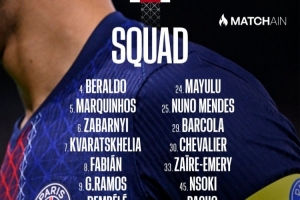 體育資訊1月16日訊 北京時間明天凌晨4點,巴黎圣日耳曼將在法甲第18輪比賽中主場對陣?yán)餇?,巴黎圣日耳曼公布了此役的球員名單。若昂·內(nèi)維斯肌肉不適缺席。