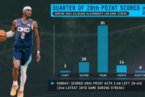 上一場比賽,在第四節(jié)還剩1分48秒時拿到第20分(為連續(xù)得分紀錄期間,單場拿到20分時間點第二晚的比賽)