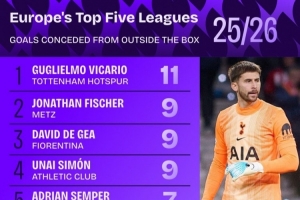本賽季五大聯(lián)賽門(mén)將禁區(qū)外失球榜: