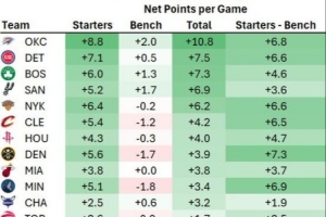 體育資訊3月17日訊 今天,數(shù)據(jù)分析師Dean Oliver統(tǒng)計了本賽季聯(lián)盟各隊首發(fā)陣容和替補陣容的凈效率(百回合凈勝分)。