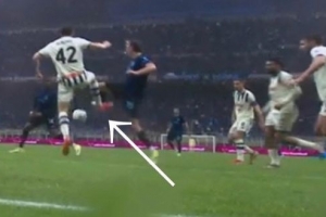 VAR裁判室: “讓我看之前那個(gè)角度:這里他踢到了球,國(guó)米球員也碰到了。動(dòng)作很輕。讓我看動(dòng)態(tài)回放:他的腿是彎曲的……檢查完畢,動(dòng)作很輕,雖然有接觸但非常輕微。觸碰極小,并不是踢了一腳?!?/p>