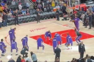 賽前,籃球評論員王猛曬出現(xiàn)場視頻,并寫道:“湖人賽前儀式結(jié)束,一個都沒進(jìn),但還挺逗?!?/p>