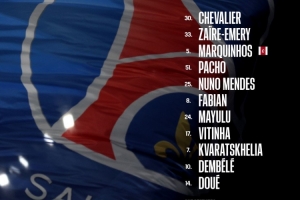 30-舍瓦利耶、33-扎伊爾·埃梅里、5-馬爾基尼奧斯、51-帕喬、25-努諾·門(mén)德斯、8-法比安·魯伊斯、24-馬尤盧、17-維蒂尼亞、7-克瓦拉茨赫利亞、10-登貝萊、14-杜埃