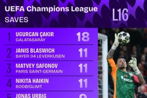 據(jù)Squawka統(tǒng)計,加拉塔薩雷門將恰基爾對陣?yán)锲謨苫睾献龀?8次撲救,包括撲出薩拉赫的點球,本屆1/8決賽撲救次數(shù)最多。恰基爾次回合比賽做出11次撲救,近10個賽季歐冠淘汰賽單場撲救次數(shù)最多。