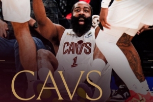 賽后球隊(duì)發(fā)布哈登海報(bào)慶祝勝利,畫面為哈登坐在地上被隊(duì)友拉起瞬間。