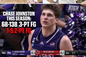 本場比賽,海波特大學(xué)后衛(wèi)蔡斯·約翰斯頓成為球隊取勝功臣,值得一提的是身為三分球?qū)<业乃緢霰荣惽百惣救?32投64中,兩分卻是4中0,本場比賽過后,三分變成138中68,兩分5中1,而這唯一的兩分球就是最關(guān)鍵的上籃絕殺(此前追到只差1分的三分球也是他投的)!
