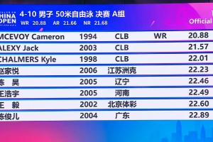 體育資訊03月20日訊 中國游泳公開賽男子50米自由泳A組決賽,31歲的澳大利亞選手卡梅倫·麥克沃伊游出20秒88,打破世界紀錄奪金。杰克·阿萊克西21秒57奪得銀牌,凱爾·查爾默斯22秒01奪得銅牌。