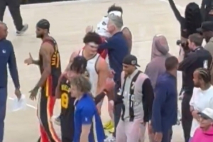這是庫明加被交易后首次面對(duì)老東家,賽后他和前隊(duì)友擁抱致意,也和主教練科爾簡(jiǎn)單握手擁抱,最后還和庫里聊了一會(huì)。